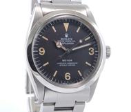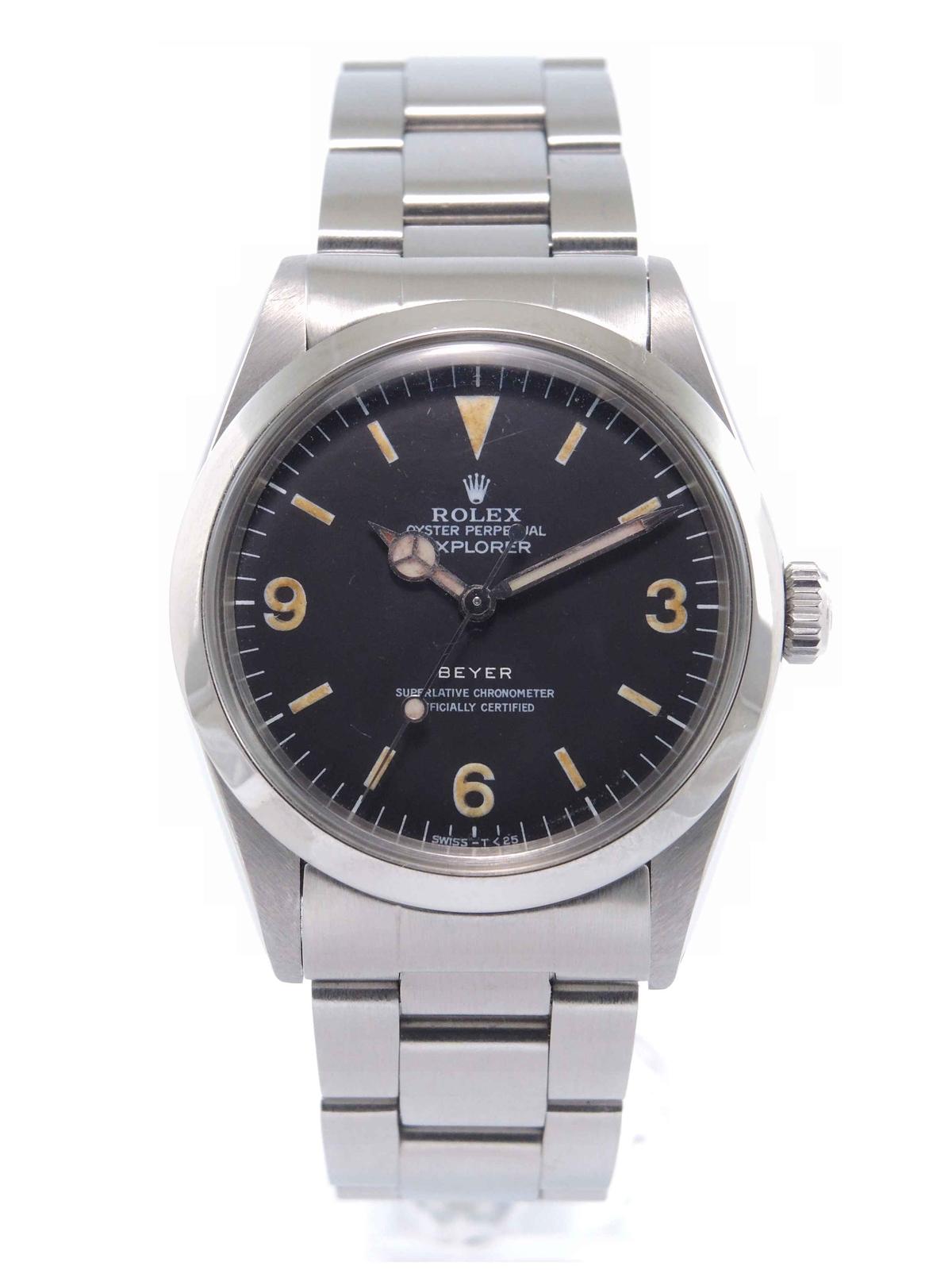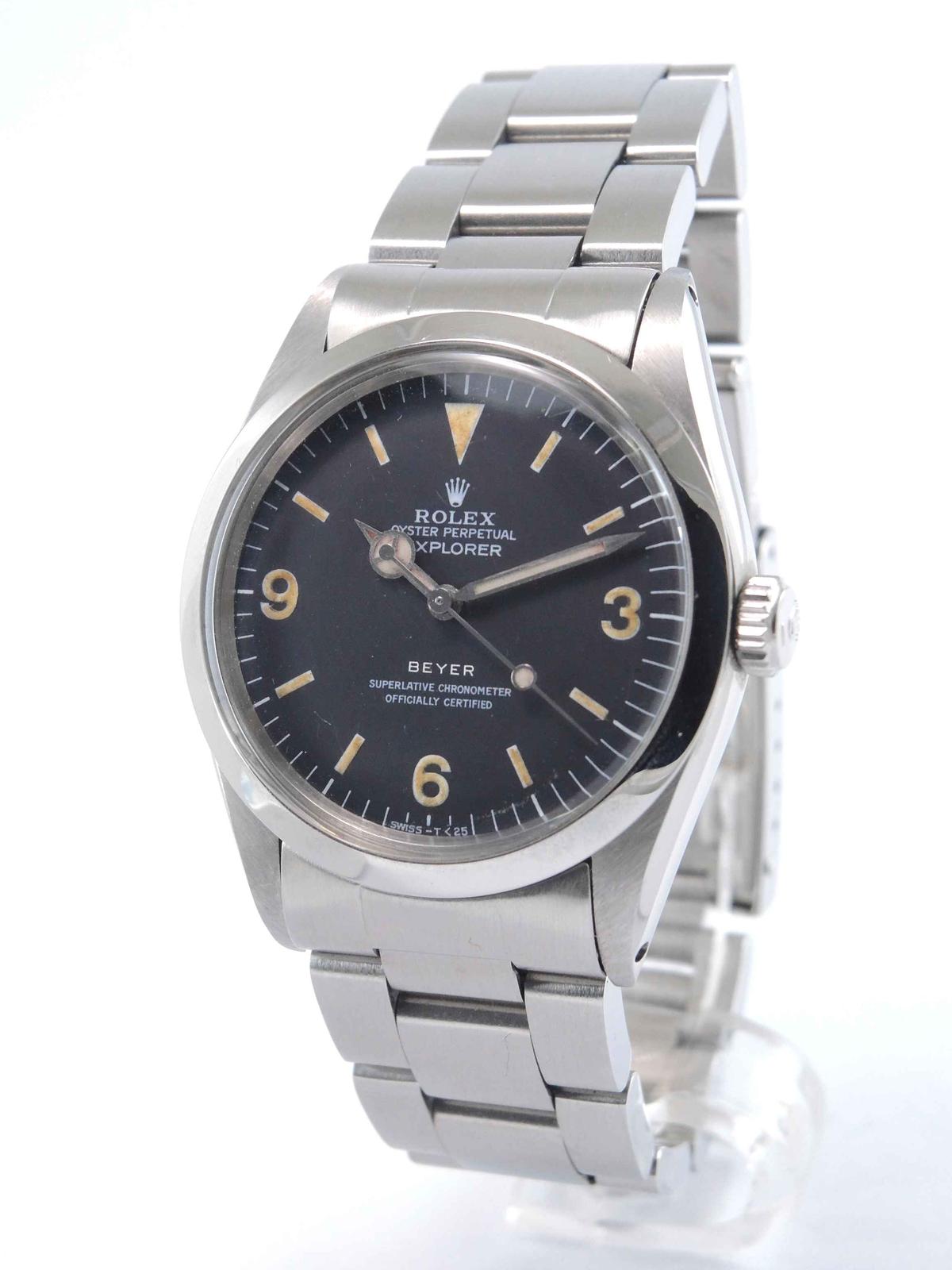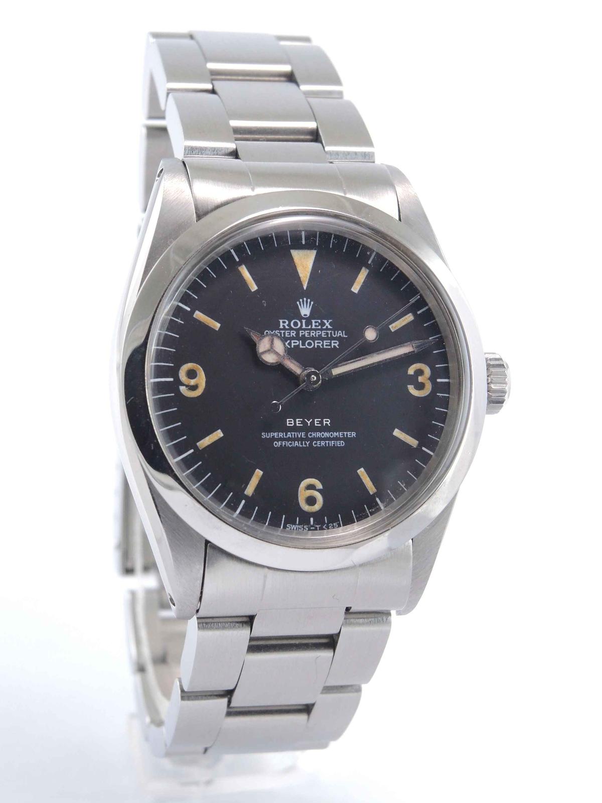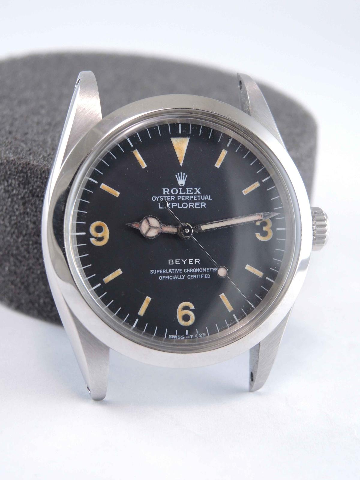 20 000 €Explorer I 1016 Beyer Dial Full steel, Oyster bracelet, rare black "Swiss-T<25" dial with double signature "BEYER", smooth bezel, plexiglass, screw down crown, chronometer certified automatic movement (COSC).
