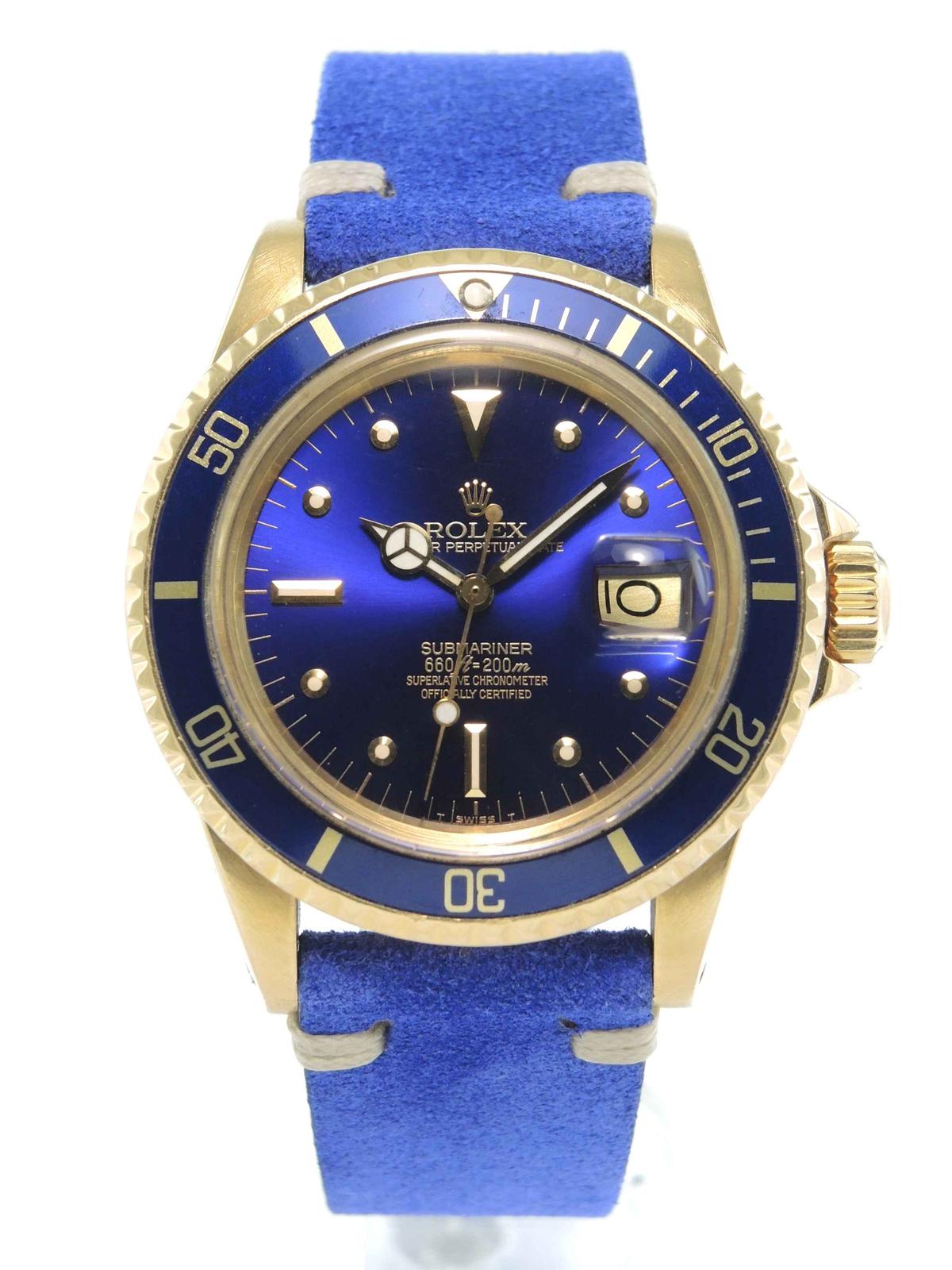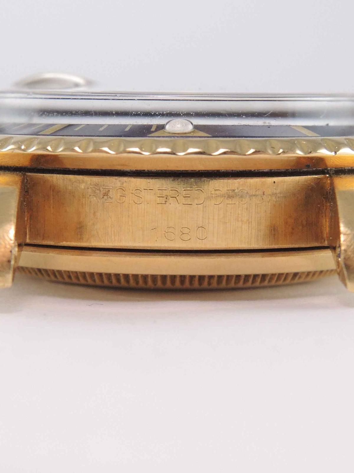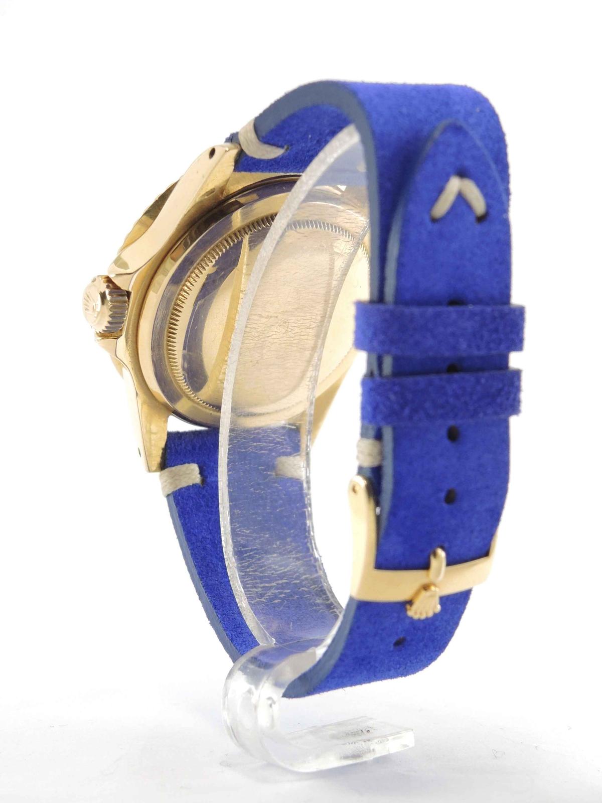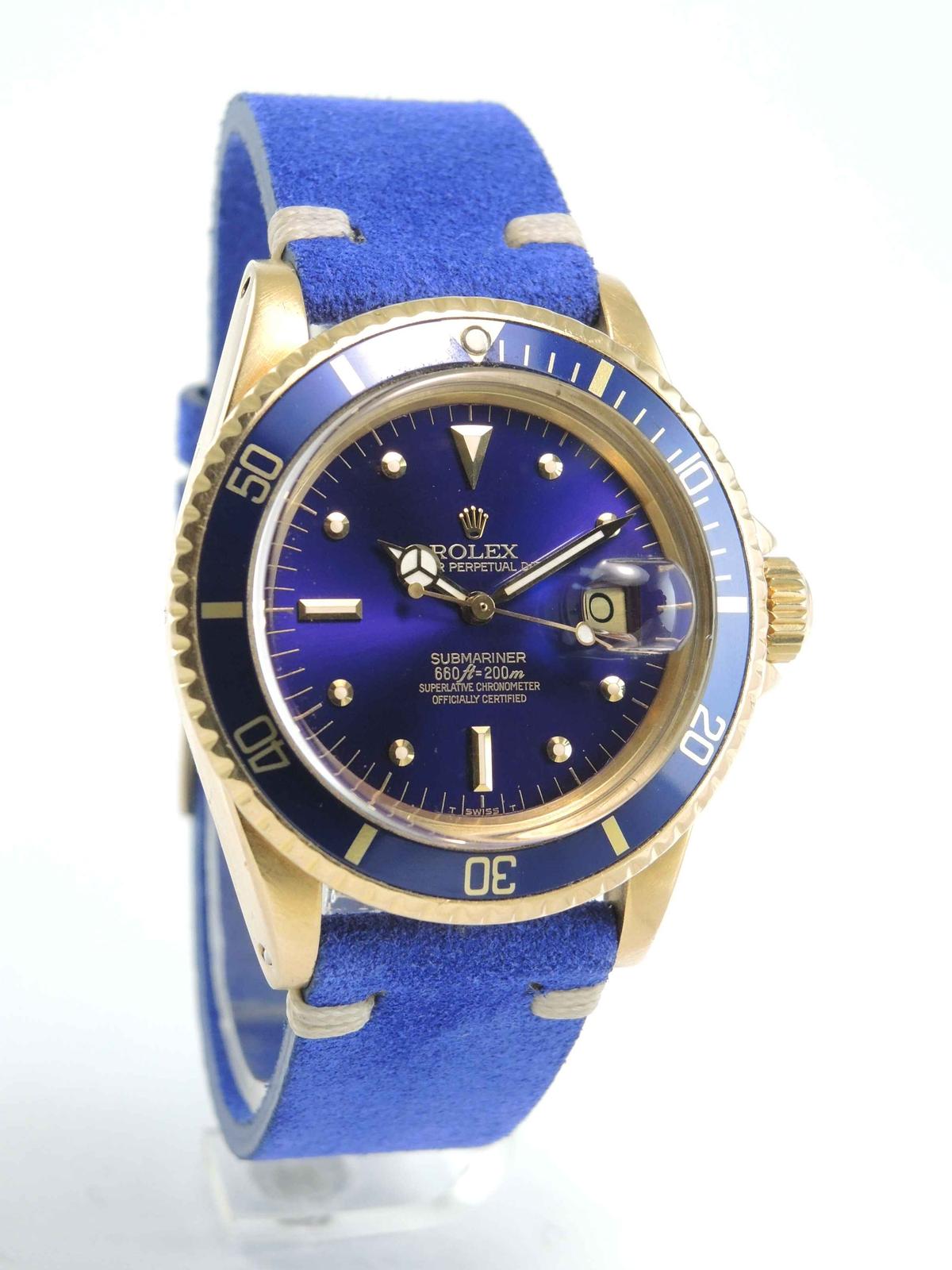 32 500 €Submariner 1680 Purple "nipple" Dial 18k yellow gold case on leather strap, purple "nipple" dial, date, plexiglass, screw down crown, chronometer certified automatic movement (COSC).