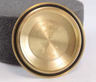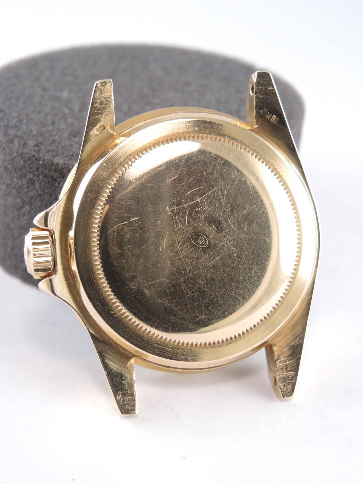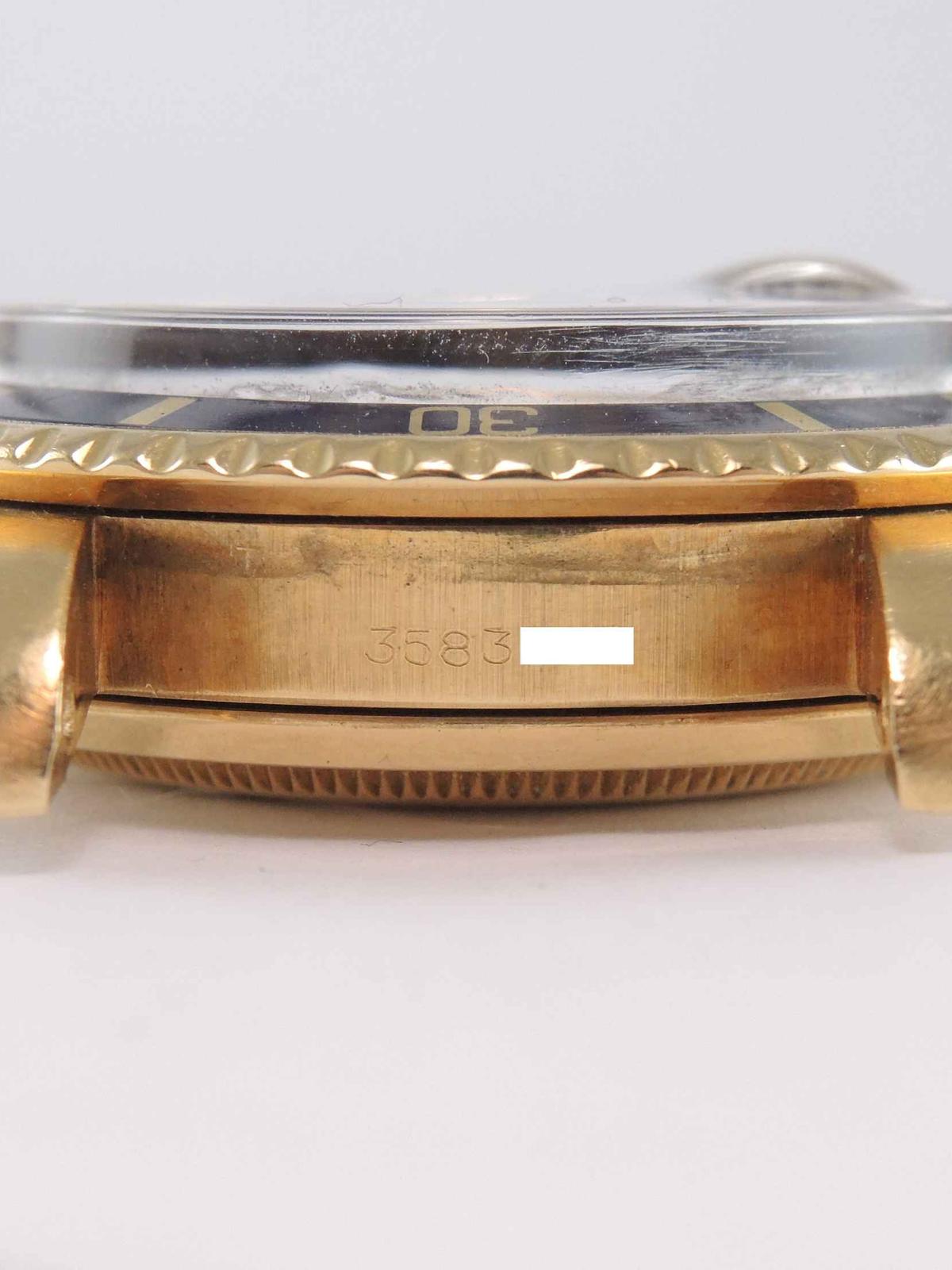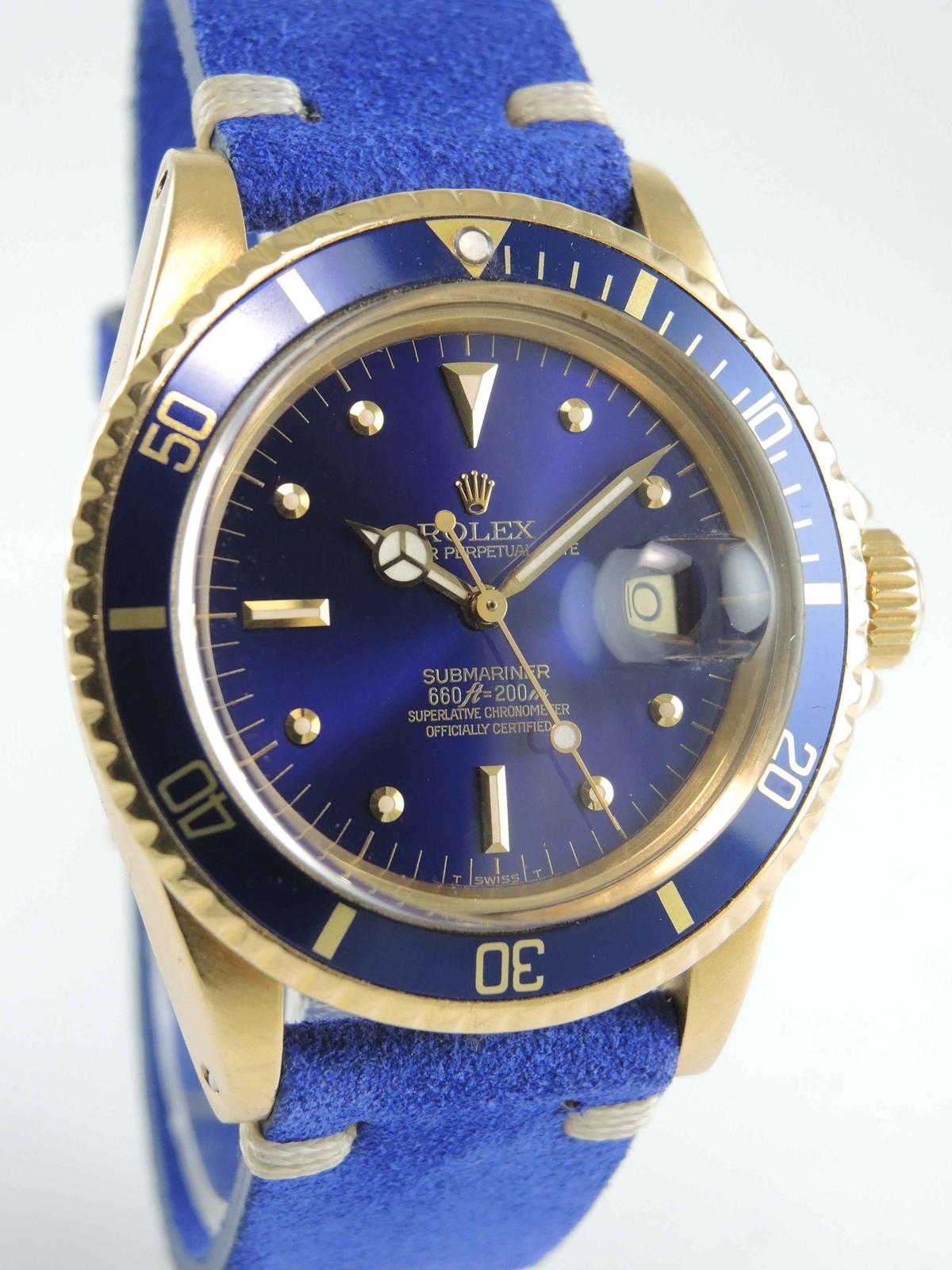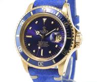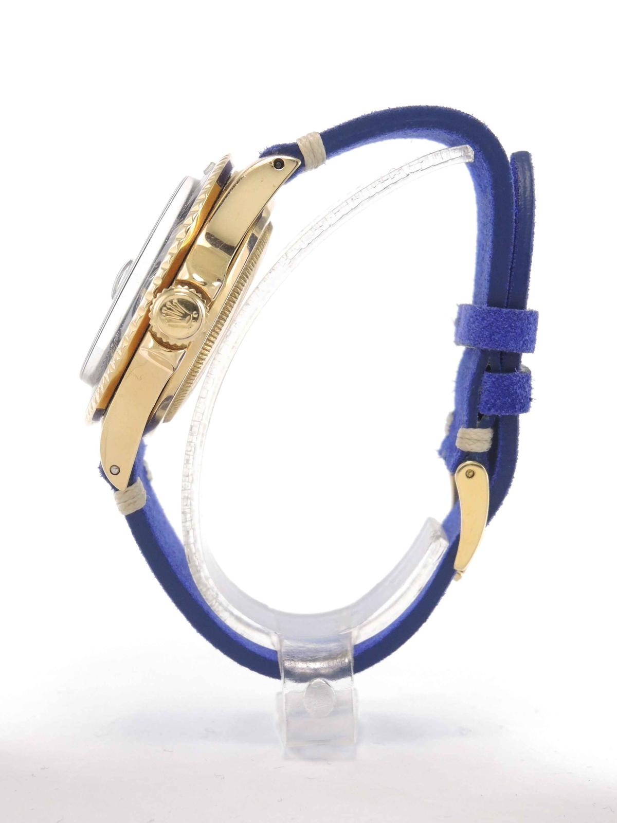 32 500 €Submariner 1680 Purple "nipple" Dial 18k yellow gold case on leather strap, purple "nipple" dial, date, plexiglass, screw down crown, chronometer certified automatic movement (COSC).
