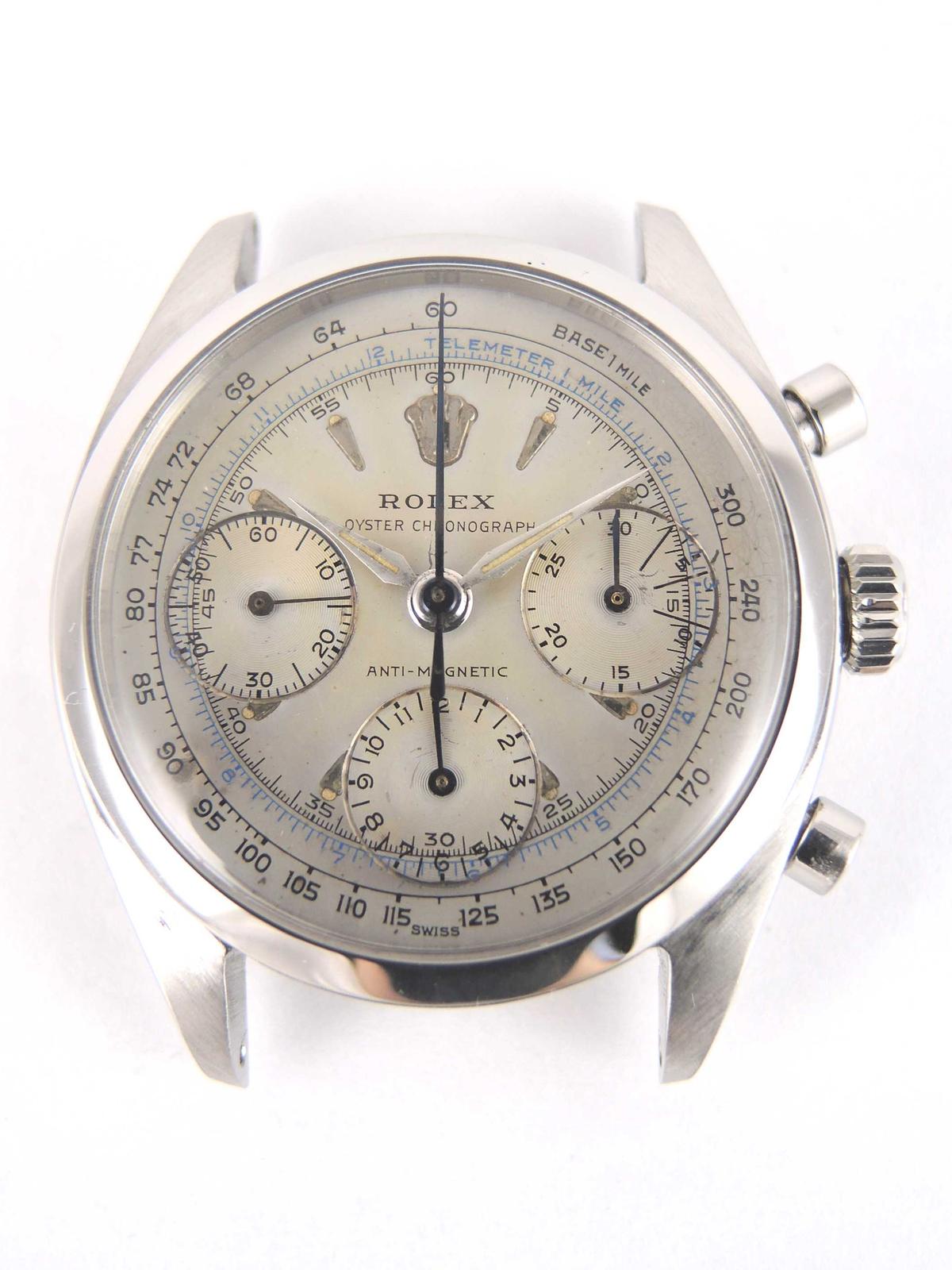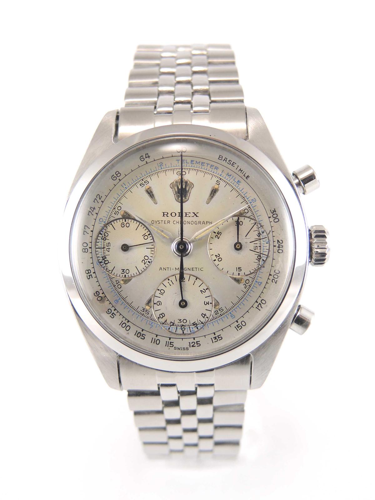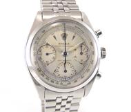 46 500 €Pré-Daytona 6234 Anti-Magnetic "Telemeter" "Big Eyes" "Blue Scale" Big Eyes Registers, blue telemeter scale, Full steel, "Made in USA" "JB"Jubilee bracelet, silver "Swiss" dial, chronograph, three registers, plexiglass, screw down crown, hand wound movement, caliber Valjoux 72. Ultra-rare configuration ! Undervalued collector, grab it while you can !