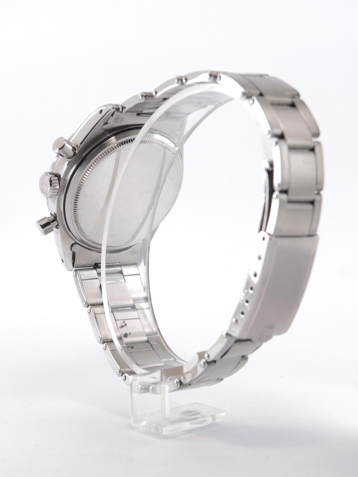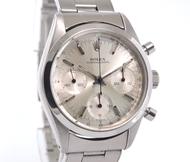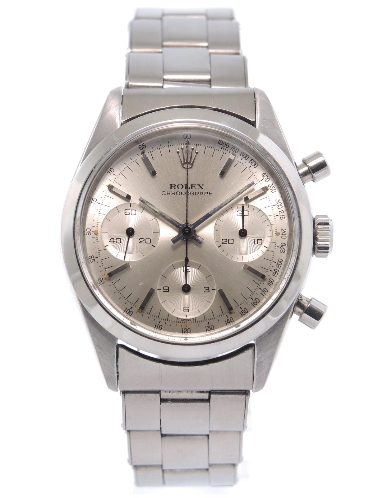 43 500 €Pre-Daytona 6238 Full steel, riveted Oyster bracelet, sunburst silver dial "T Swiss T", applied stick markers, chronograph, three registers, smooth bezel, plexiglass, pump pushers, screw down crown, hand wound movement. The mother of all the Daytona’s !