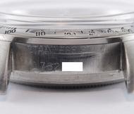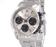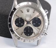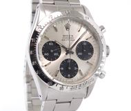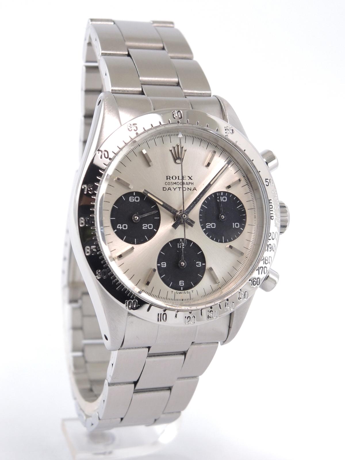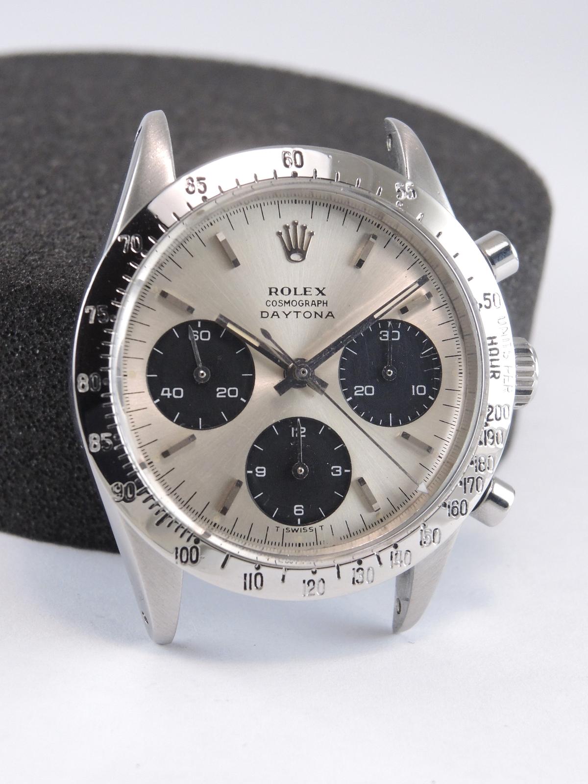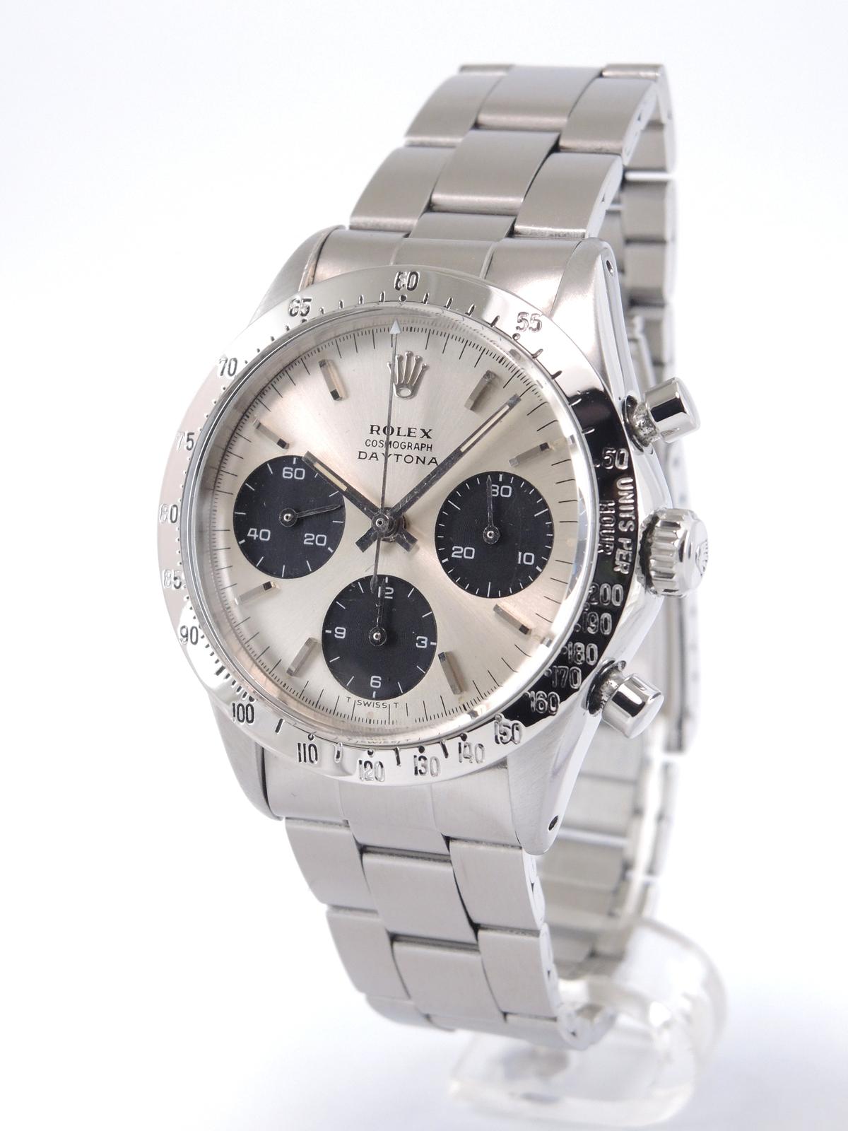 52 500 €Daytona 6239 "Big Daytona" Full steel, Oyster bracelet, sunburst silver dial "Big Daytona" "T Swiss T"-", applied stick markers, three registers, steel tachymeter bezel, plexiglass, screw down crown, pump pushers, hand wound movement, caliber Valjoux 72B. The first Cosmograph Daytona!